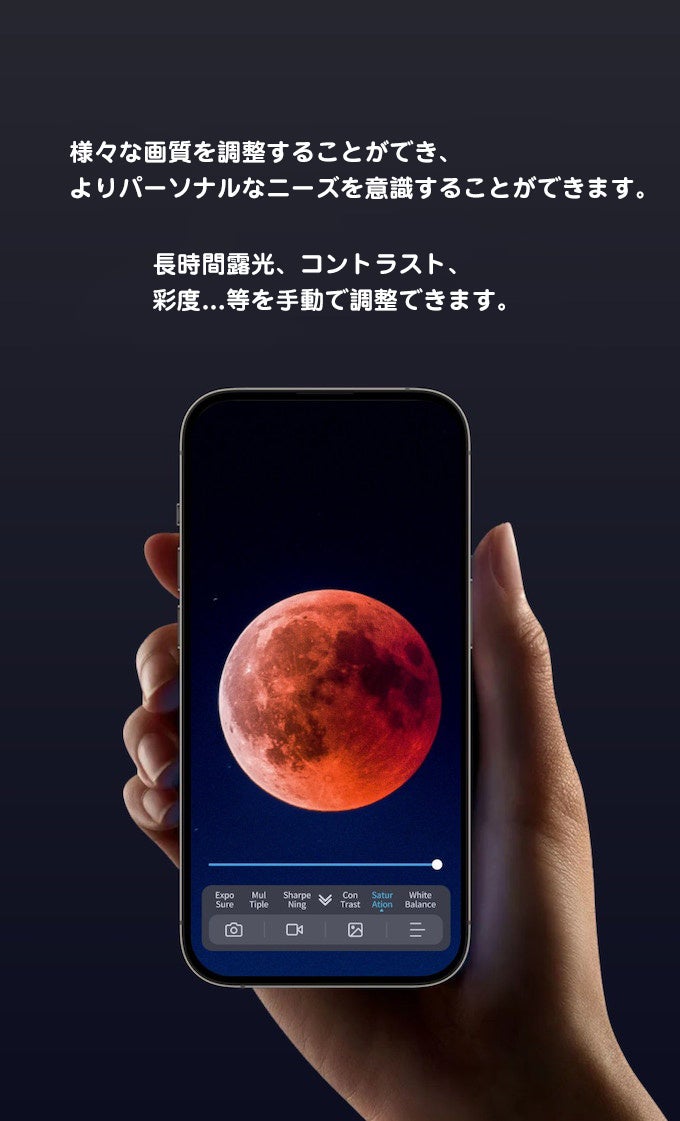 とはいえ、AIの機能だけでは完璧な撮影設定にできませんので、撮影者自身で調整しなければならない要素もいくつかあります。手軽に美しい天体写真を撮れるとはいえ、撮影者個人の腕の見せどころや上達の余地も残されているのが、スマート天体望遠鏡の最大の魅力と言えるでしょう。