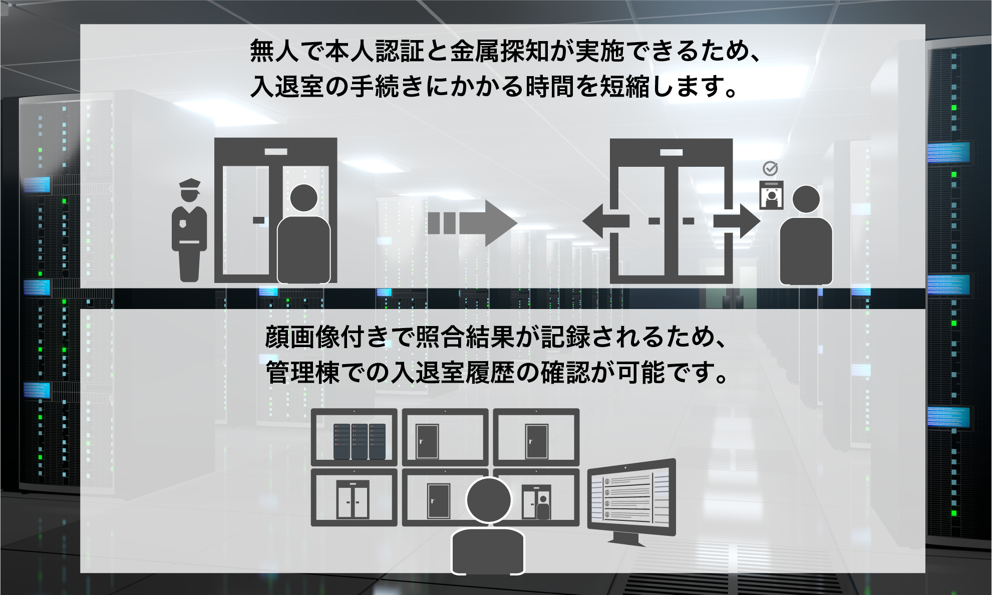 ① 無人で本人認証と金属探知が実施できるため、入退室の手続きにかかる時間を短縮します。