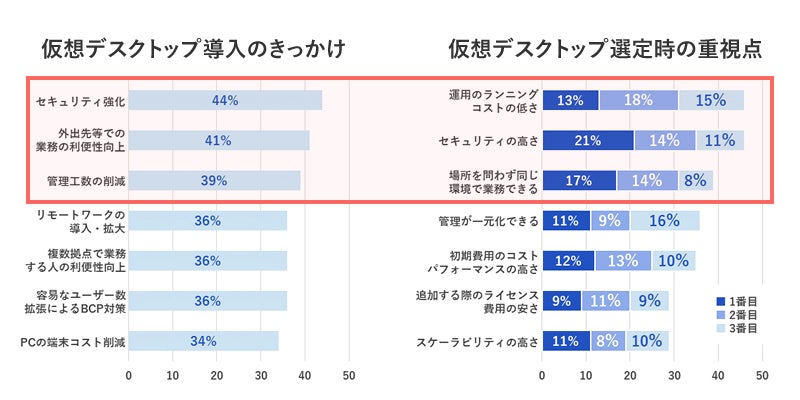 仮想デスクトップの導入のきっかけは、「セキュリティ強化」「外出先等での業務の利便性向上」「管理工数の削減」の3点が上位になっており、選定時の重視項目にも反映されていました。
