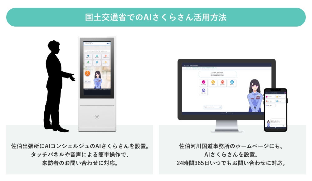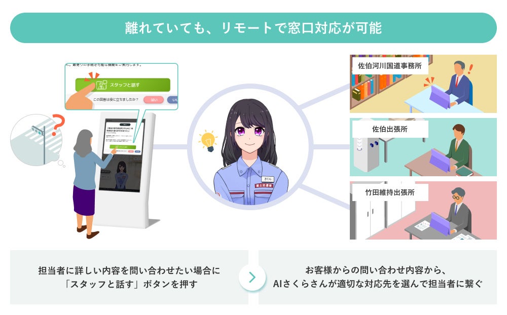 また、どの部署に問い合わせればよいか来訪者が分からない場合でも、河川の許認可手続きや道路工事の問い合わせなど、質問内容を判断して「AIさくらさん」が担当部署へ取り次ぐことができるため、スムーズな問い合わせ対応が可能となりました。