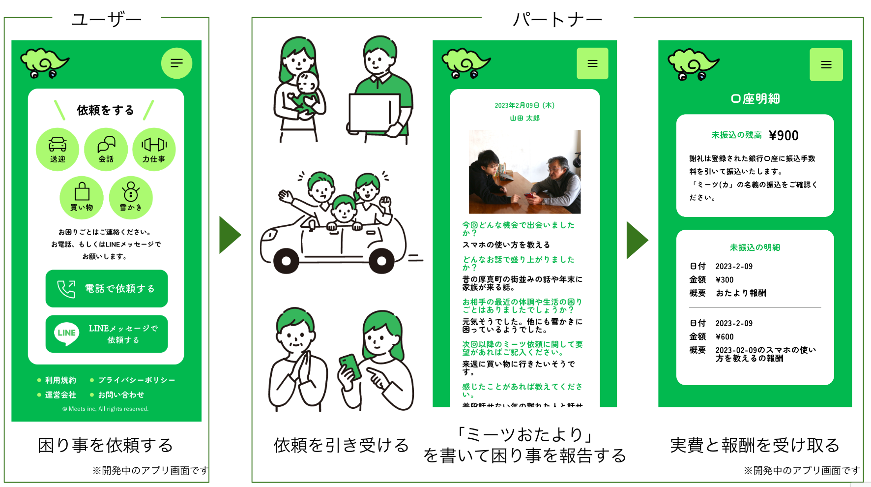 少子化・高齢化・過疎化・医療費が増加など課題先進地域である日本だからこそ、新たな取り組みを通じて課題「解決」先進地域に。様々な課題がありイノベーションを通じなければならない北海道だからこその取り組みを、人口4400人の厚真町からチャレンジを実施しております。ミーツ株式会社は過疎地だからこそできる、ある種の「長屋家族」のような概念に通じるような、共助型困り事解決プラットフォームを企画運営しております。住民の困り事をアナログにでも得られたものをデジタル化して、地域で解決できうる住民にマッチングを促し、法律に基づいて支払える金額を協力してくれたパートナーに支払います。自分の生活の「ついで」にて、地域の困り事を解決して、少額ながらも謝礼をいただき新たな繋がりを育み、自然と笑顔をいただき「コミュニティ」を形成することができるサービスをITを用いながら実現しようとしております。若者が高齢者を支援することもあれば、逆に様々な人生のストーリーをシェアしてもらえたり、おばあちゃんの知恵袋を共有いただいたりできる場作りが自然とおき、多世代交流における情報の交換が実施されるコミュニティを運営しております。