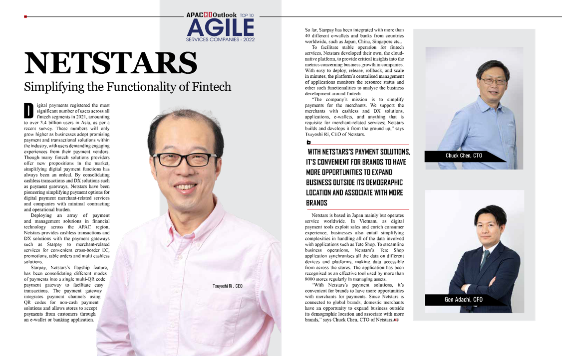 『APAC CIO Outlook』が発表している「トップ10アジャイルサービス企業」は、プロジェクトを円滑に進行させるために重要なアジャイルソフトウェア開発力に焦点を当て、世界中のITサービス提供者の中から特に優れた開発力を発揮したトップ10社が選出されるものです。『APAC CIO Outlook』は、ネットスターズの提供する「StarPay」が国内外の多数の決済ブランドに一括対応及び一元管理でき、その利便性が高い点を選出理由に挙げています。また、キャッシュレス決済の利用ユーザー及び導入企業の増加に伴い、キャッシュレス関連サービスを提供する企業への要求が高まっていることに言及しています。こうした状況下において、キャッシュレス取引と決済ゲートウェイを統合したネットスターズのDXソリューションとしてのサービス「StarPay」が、導入企業の負担を軽減する点を高く評価しています。