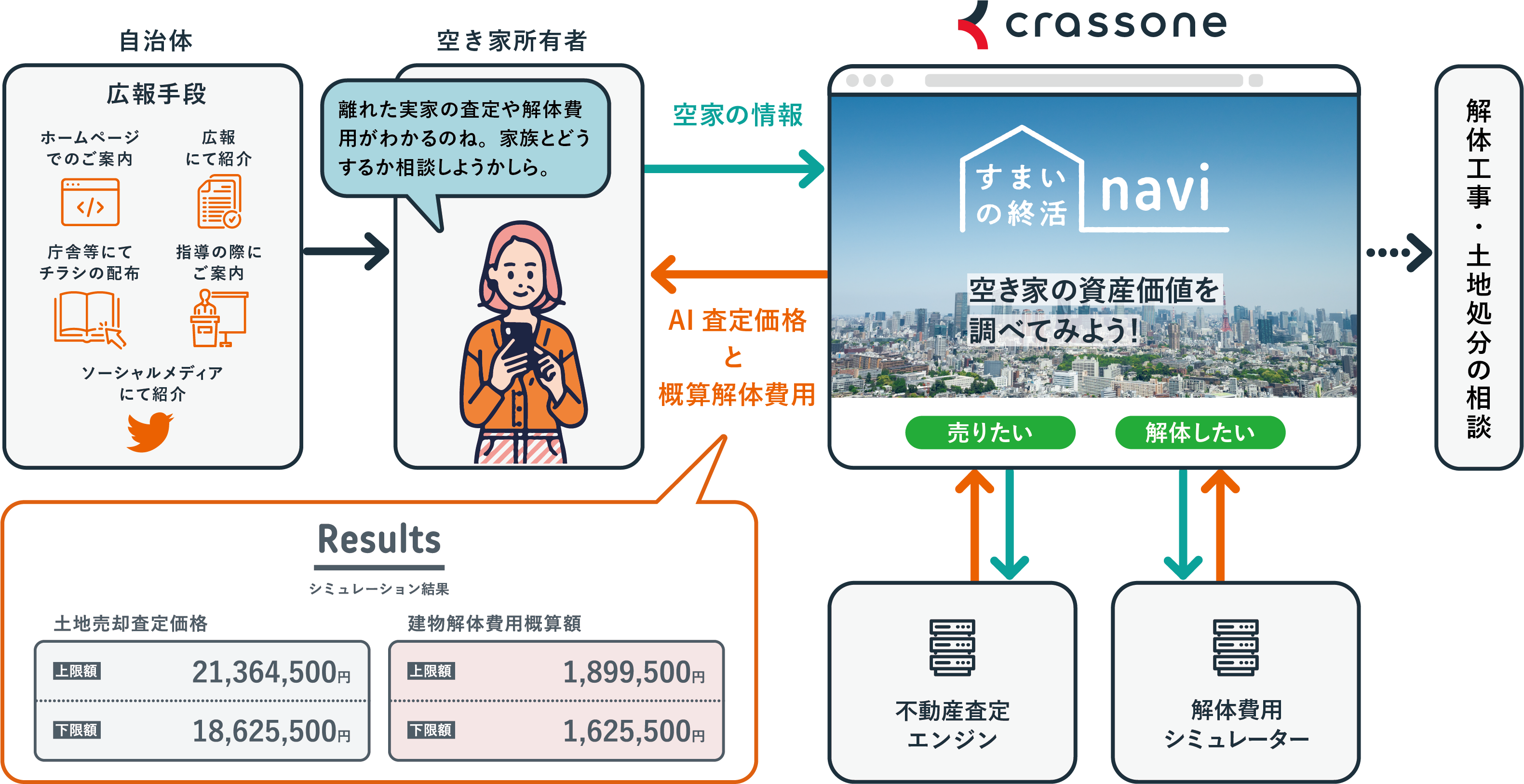 スマートフォン等から土地建物の面積や最寄り駅、接する道の幅などの条件を入力することで、「解体費用」と解体後の「土地売却査定価格」の概算額を手軽に無料で把握することができ、「解体費用がどのくらいか分からない」といった情報不足の解消や、解体後の土地売却の見通しが立たないために空き家の解体に踏み切れない所有者の意思決定の後押しを行います。算出にあたっては、市内の解体相場や市場価格などの地域性が反映されています。