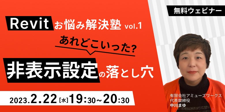 第1回のテーマは「あれどこいった? 非表示設定の落とし穴」。BIMエンジニアとしてもご活躍され、Revitの普及活動や企業へのBIM導入支援もされている中川まゆ氏にご登壇いただき、Revitでよくある悩みのひとつでもある「非表示設定」についてわかりやすく解説していただきます。BIMエンジニアとしてのキャリアが比較的浅い方やBIMをこれから勉強されたい方に特におすすめの内容です。ご興味をお持ちの方はお気軽にご参加ください。