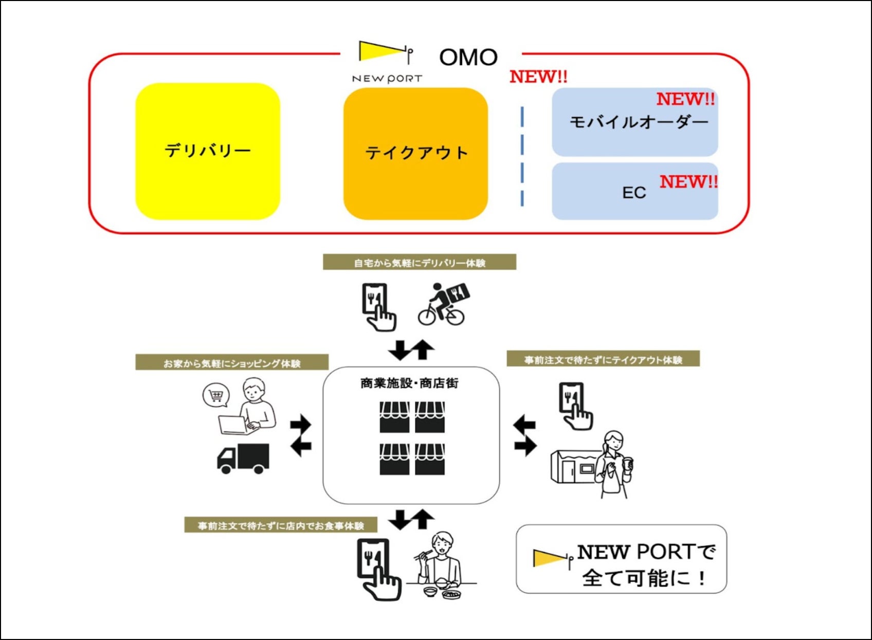 当社が運営する「NEW PORT」は、デリバリーやテイクアウトなどを一元管理できるプラットフォームです。本サービスは商業施設単位で店舗を跨いだ一括購入が可能な「買いまわり機能」に特長を持ち、現在は横浜に位置するランドマークタワーやMark Isなどに入居している飲食店の料理をオンラインから注文できます。