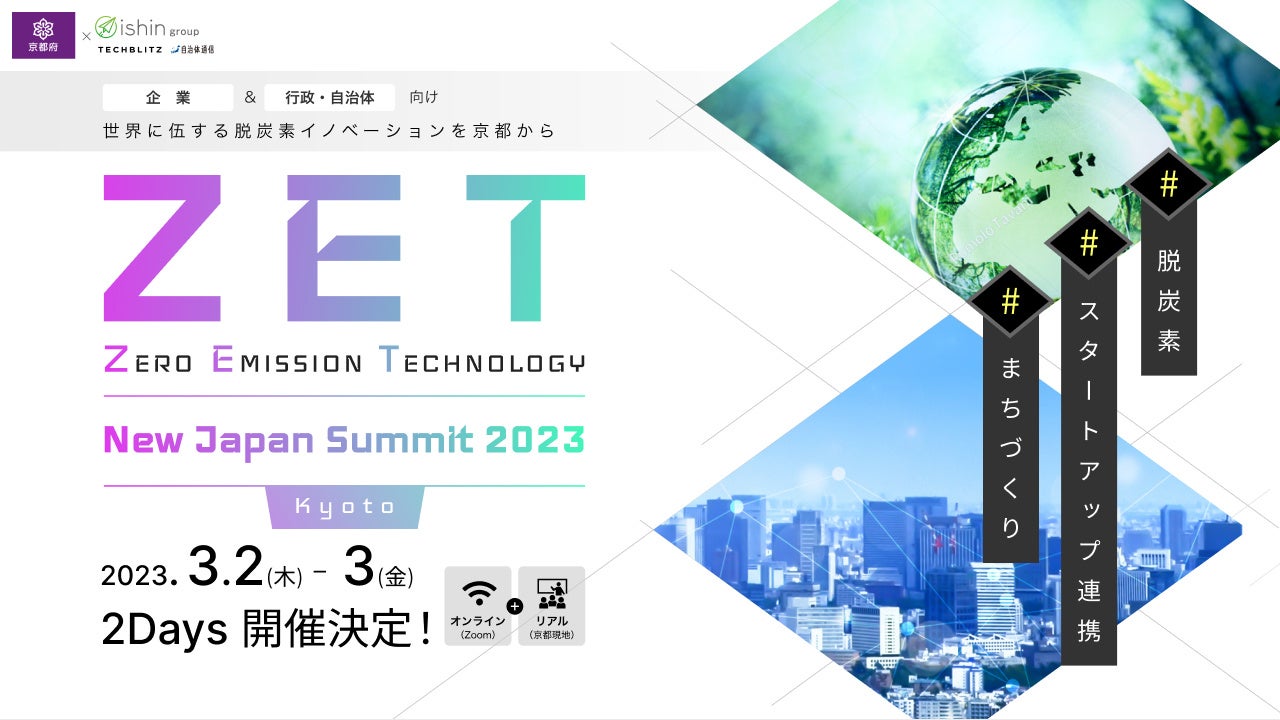 ZET(Zero Emission Technology)New Japan Summit 2023 Kyotoは、国内外の脱炭素テクノロジー(ZET:Zero Emission Technology)関連スタートアップ等との協業、まちづくり・地域産業への技術導入をテーマに、産学公の関係者が一堂に会し事例の共有を図り、新たな交流と共創が生まれる場として開催されます。
