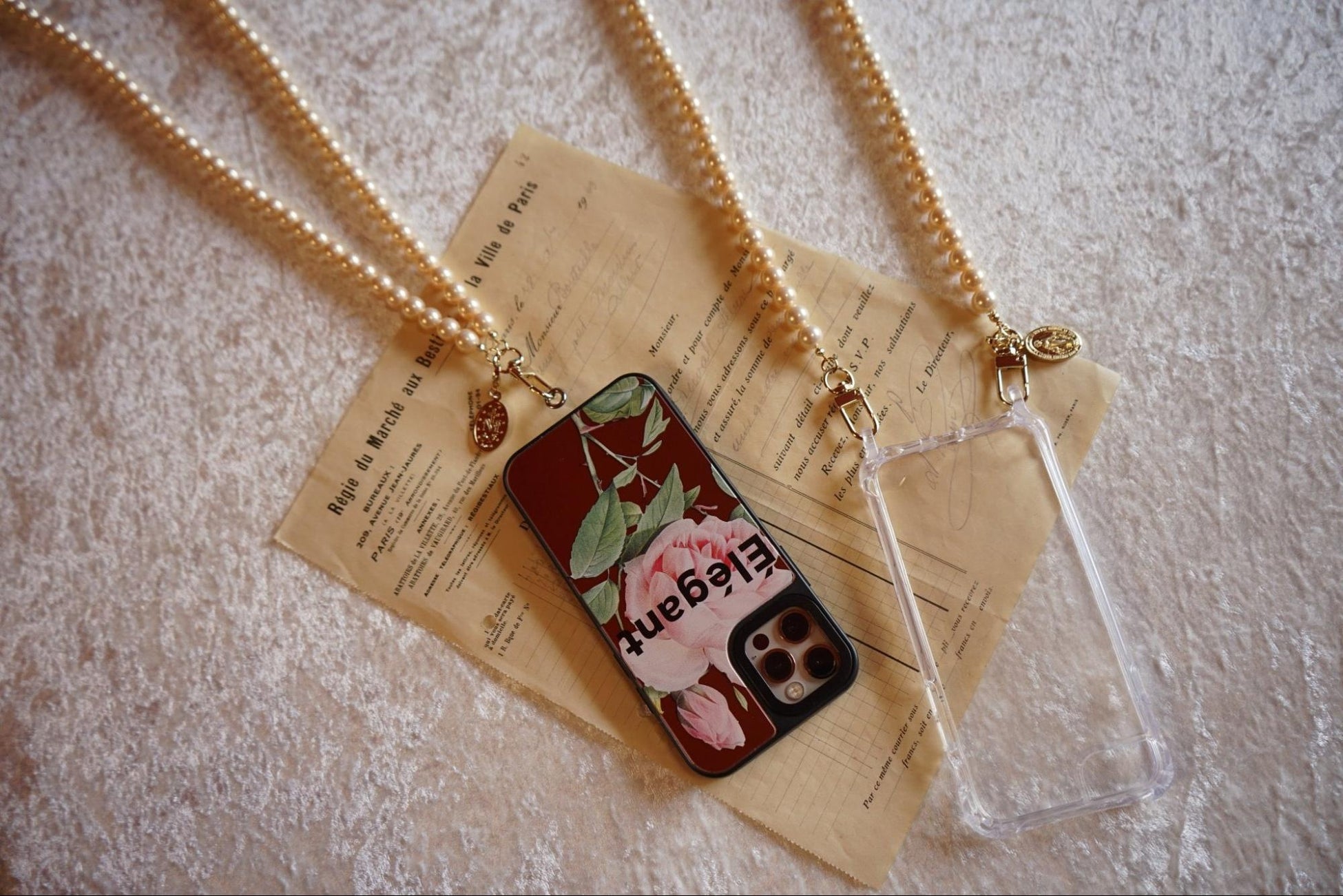 また、大人かわいいピンクパールのスマホショルダーも同時に発売中。