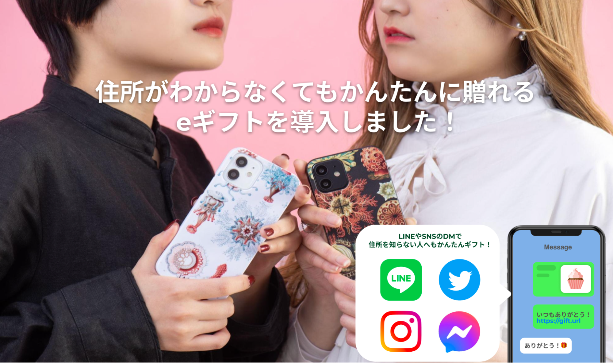 Shopifyアプリ「All in gift」を活用すれば、LINEやTwitter、InstagramのDMで「ギフト受け取り用」のURLを送るだけで、かんたんにギフトを贈ることができます。