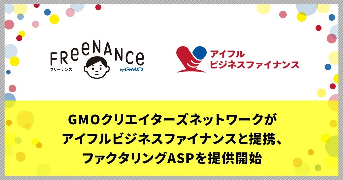 GMOクリエイターズネットワークは、フリーランス・個人事業主を応援する企業・自治体との提携プログラム『FREENANCEともだち(2019年7月開始)』や、「FREENANCE byGMO」のサービスを外部企業やサービスに少ない工数で導入可能なASP・APIの提供といった『FaaS構想(2020年11月発表)』(※4)を通じて、幅広い業界で活躍するフリーランス・個人事業主への金融支援を加速させています。資金ニーズに即日で応える「FREENANCE byGMO」のファクタリング機能をいつでも・どこでも活用できる環境をより一層整えるべく、今後も外部企業との提携を進めてまいります。(※4)(FREENANCE / Factoring as a Service)」(URL:https://freenance.net/archives/news/1724/) 【アイフルビジネスファイナンス株式会社について】(URL:https://www.aiful-bf.co.jp/)