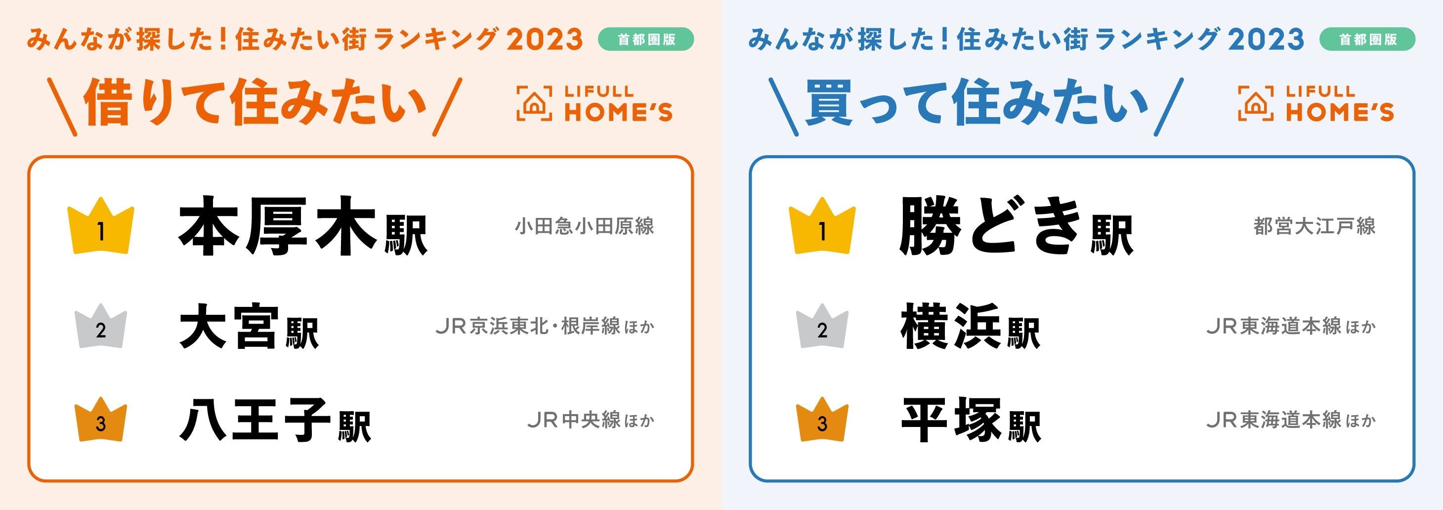 【首都圏版ランキング結果のポイント】 <借りて住みたい> ・コロナ禍3年間は「本厚木」が1位独占!「都心から郊外へ」という動きは、物価高騰の影響も ・中間発表で1位を獲得した「大宮」は、僅差で「本厚木」に抜かれて今年も2位 ・都心の人気も徐々に回復傾向。急上昇ランキング1位は43ランクアップした「笹塚」 <買って住みたい> |