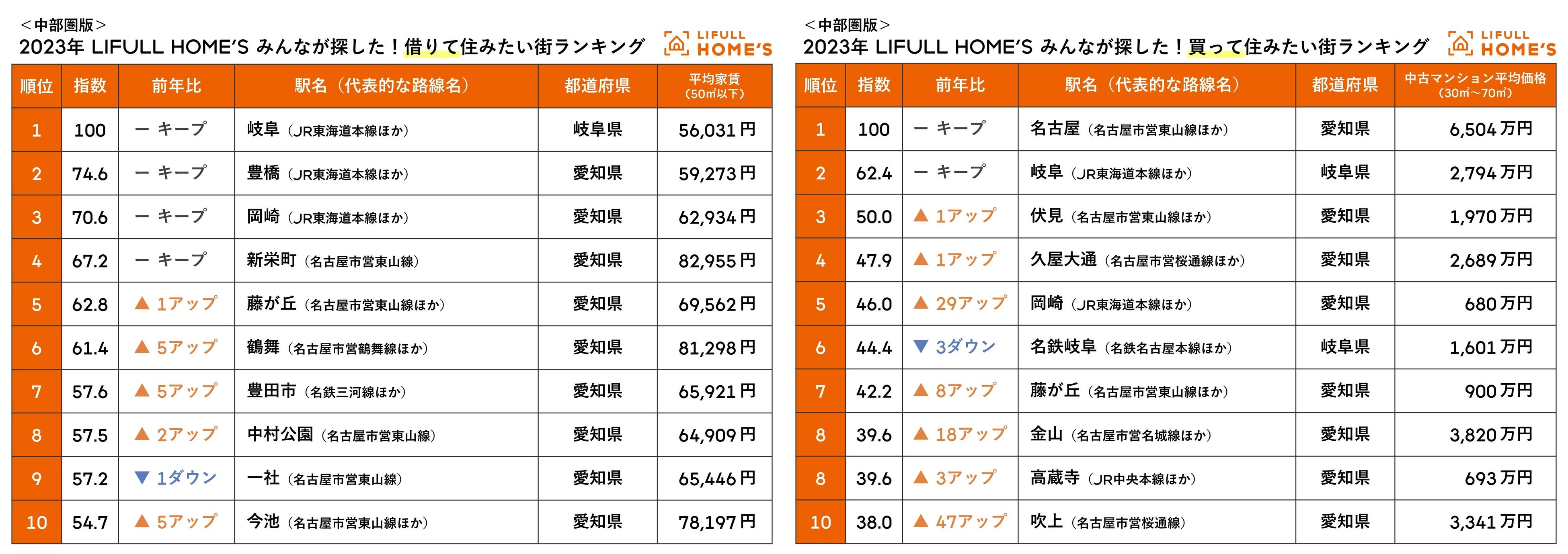 <中部圏版> 2023年 LIFULL HOME’S みんなが探した!住みたい街ランキング