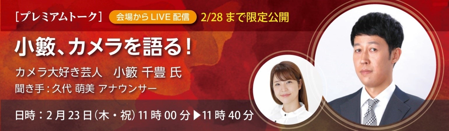 オンラインイベントでは、会期初日の2/23(木・祝)11:00~11:40から、カメラ大好き芸人の小藪千豊氏が登壇するプレミアムトークを実施!カメラとの出会いから被写体へのこだわり、撮影テクニックまで作品を紹介しながらカメラ・写真を語り尽くします。その他多数の企画をご用意しております。詳細は公式ウェブサイトにてご覧ください。