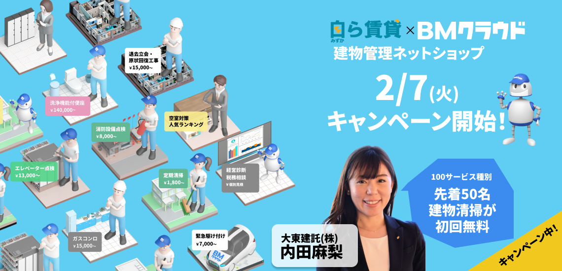 自ら賃貸とBMクラウドのコラボ企画として、「清掃初回無料(50名様限定)」キャンペーンを行います。