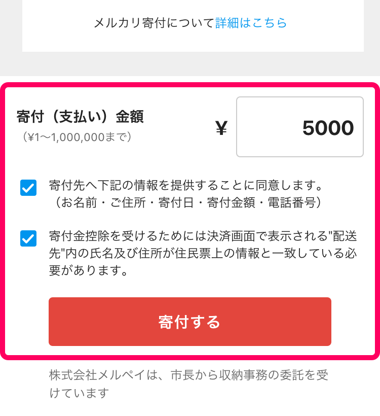 1円~100万円の間で寄付する金額を入力し、2つの同意項目にチェックを入れ「寄付する」をタッチします。