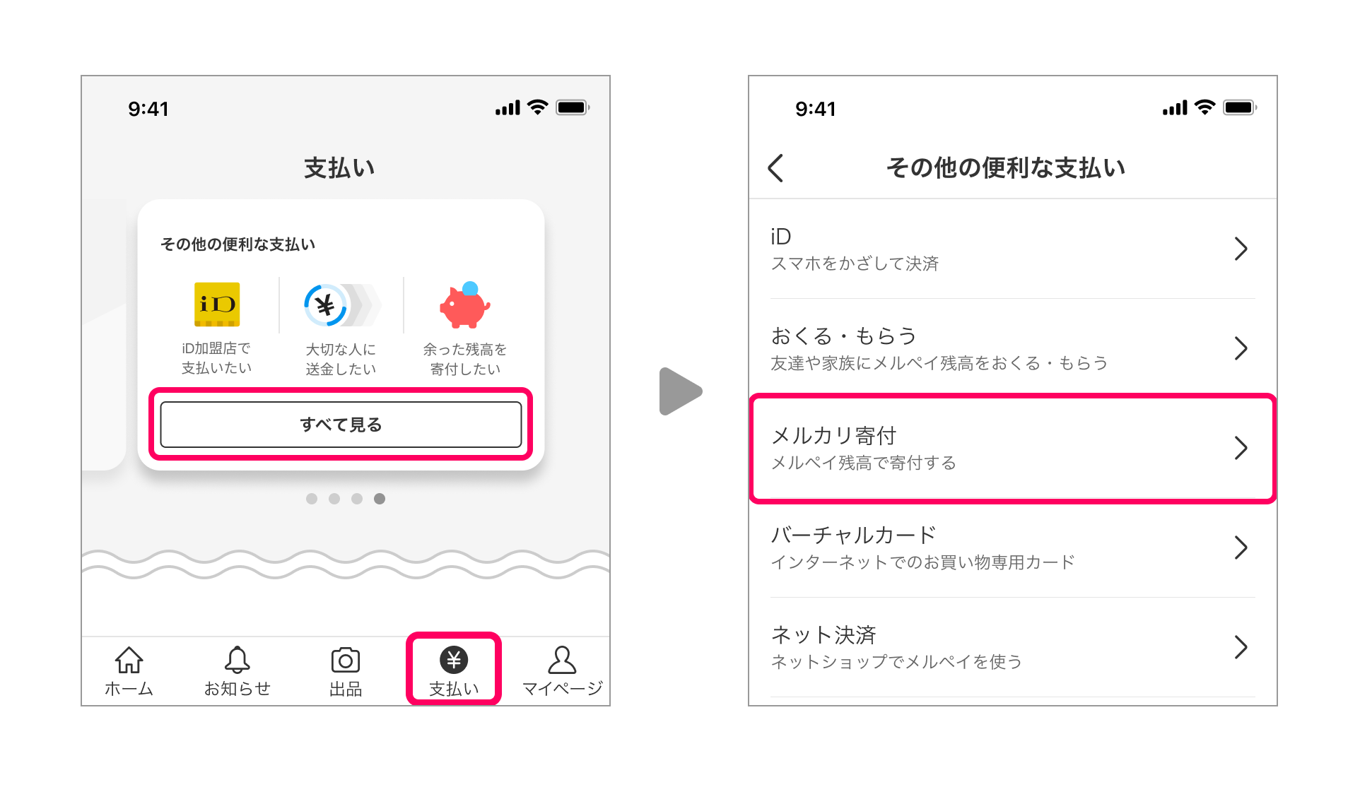 「支払い > カード券面部分をスライド > その他の便利な支払い > すべて見る > メルカリ寄付」をタッチしてください。