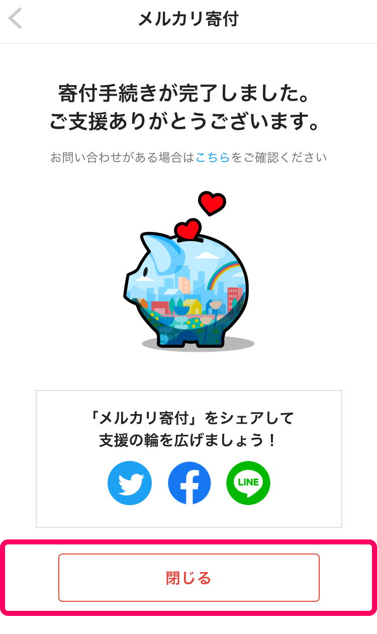 「閉じる」をタッチしてメルカリ寄付のトップ画面へ戻ってください。