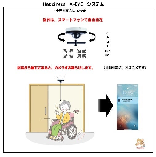株式会社ハピネスコーポレーション(本社:東京都港区 代表:木元 修二)は、約13年にわたり、病院、介護施設、障がい施設向けに、IoTの技術を取り⼊れた⾒守りシステム「Happiness絆 / ハピネス キズナ」の開発、販売を⾏っています。この度、株式会社NSKと協力し、AI搭載の2種類のカメラを連結したシステム「Happiness A-EYE / ハピネス エーアイ」を3⽉より販売開始します。また3⽉22⽇(⽔)〜24⽇(⾦)の期間で開催される、介護専門の展示会「CareTEX東京」へ出展いたします。