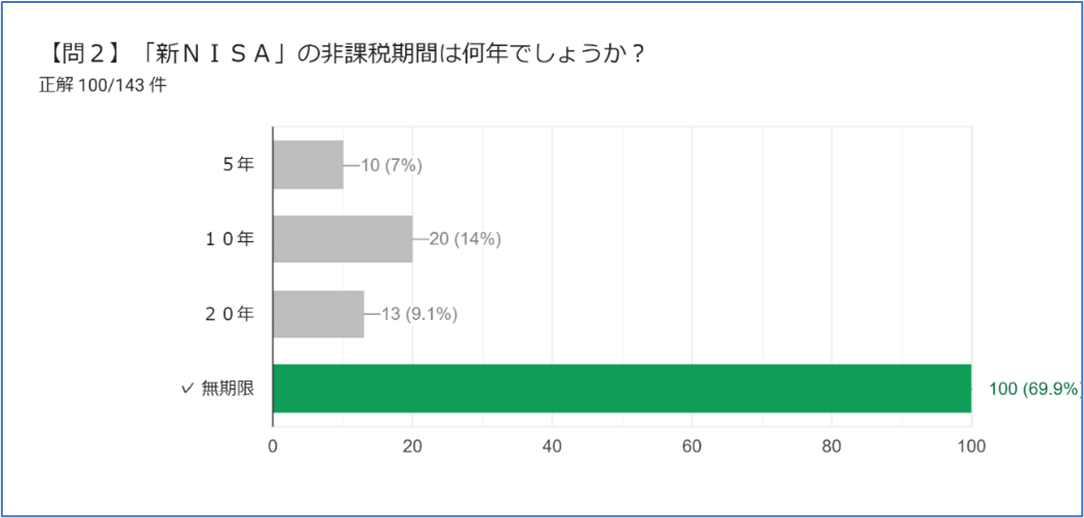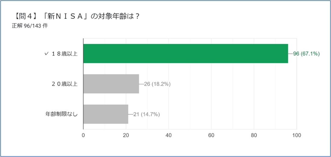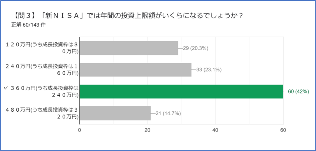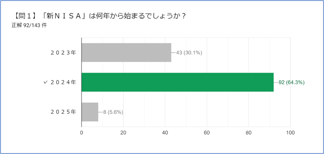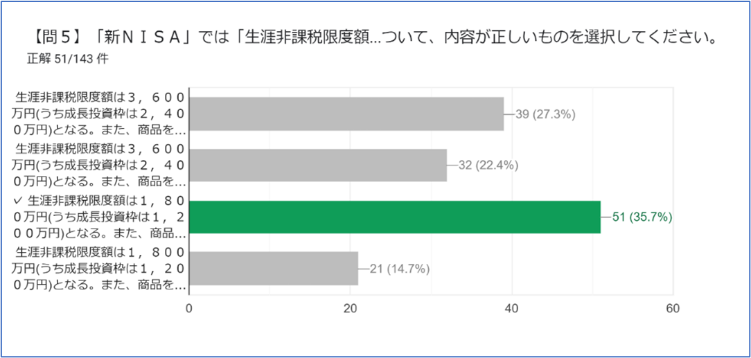 今回、「新NISA」についての理解度を調査するため、制度に関する問題を選択式で計5問作成、143名の方に回答していただきました。