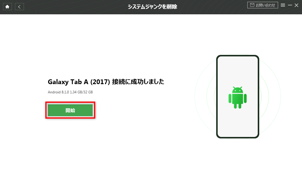 Step 4.Android端末をUSBケーブルでパソコンに接続します。Androidが検出されると、以下のインターフェースが表示されて「開始」をタップします。