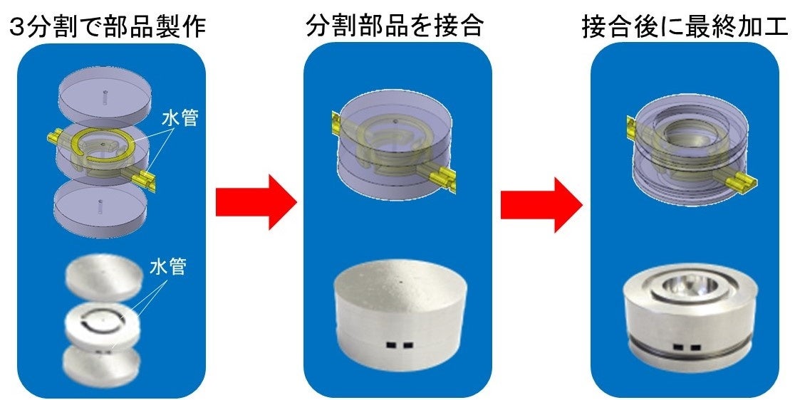 これまで、機械加工では難しく、金属3Dプリンタなどで製作していた複雑な形状の冷却水管などを含有する部品を、分割して製作し接合することで機械加工での製作を可能とする技術の開発を行っています。接合による部品製作は、金属3Dプリンタでの製作と比較し、製造工数が少ない、材料費が安価、材質選択肢が多い、製品強度が高いなどのメリットがあり、お客様の生産性向上や原価低減に貢献します。