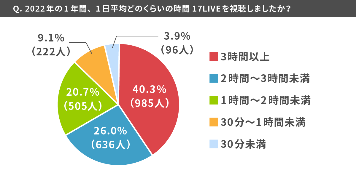 「2022年の1年間、1日平均どのくらいの時間17LIVEを視聴しましたか?」という質問では、「3時間以上」と回答した人が40.3%と最も多く、次いで「2時間~3時間未満」が26%、「1時間~2時間未満」が20.7%と、約9割が1日に1時間以上ライブ配信を視聴していた、ということがわかりました。