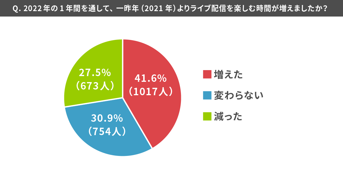 「2022年の1年間を通して、一昨年(2021年)よりライブ配信を楽しむ時間が増えましたか?」という質問では、41.6%が「増えた」と回答しました。