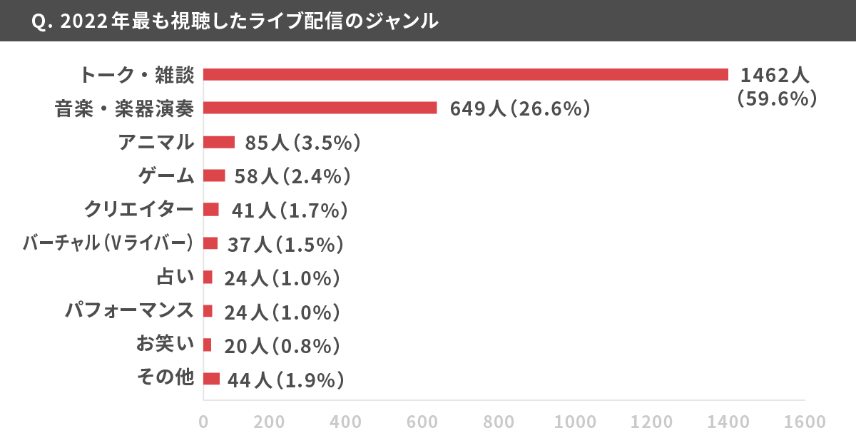 2022年に最も視聴したライブ配信のジャンルは1位「トーク・雑談(59.8%)」、2位「音楽・楽器演奏(26.6%)」、3位「アニマル(3.5%)」という結果になりました。