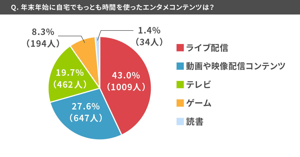 「年末年始に自宅でもっとも時間を使ったエンタメコンテンツは?」という質問には、41.3%が「ライブ配信」と回答し、「動画や映像配信コンテンツ」「テレビ」などを抑えて1位という結果になりました。ライブ配信はテレビや動画配信サービスとともに、年末年始に人気のエンタメコンテンツとして多くの支持を集めました。