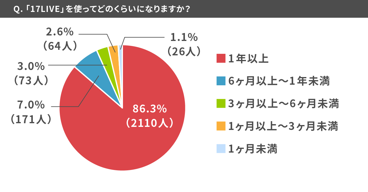 また、今回アンケートに回答したユーザーの86.3%が「17LIVE」を利用して1年以上と回答しており、多くのユーザーにとってライブ配信が年々生活の中に定着していることがわかりました。