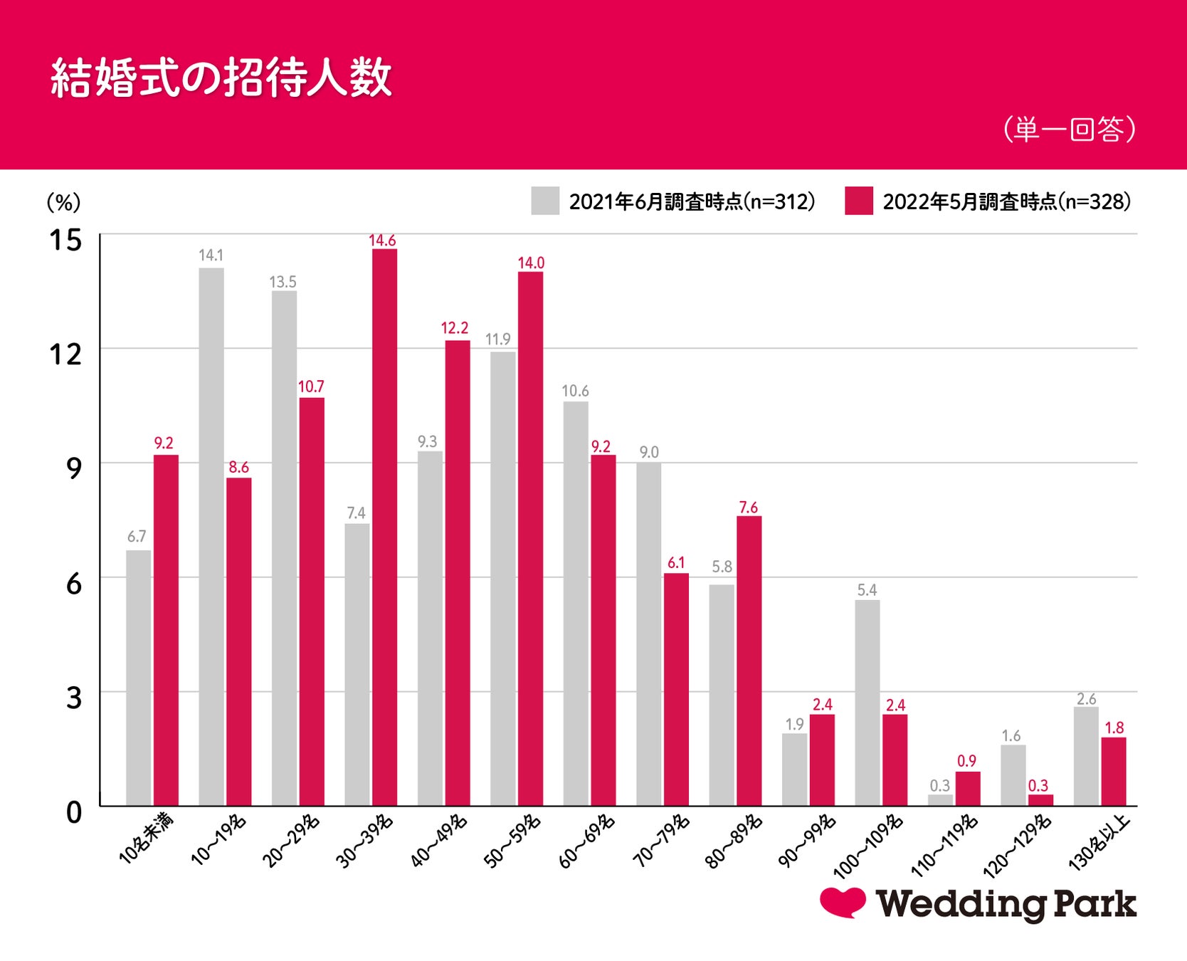 「現在検討している結婚式の人数規模を教えてください(単一回答)」と質問したところ、全体の69.3%が「60名未満」での実施を検討していることがわかりました。特に30名~59名の割合が2021年6月の調査と比べ40.8%にまで増加しており、10名~29名の割合が多かった緊急事態宣言下(2021年6月)と比べ招待人数は微増傾向にあることがわかりました。