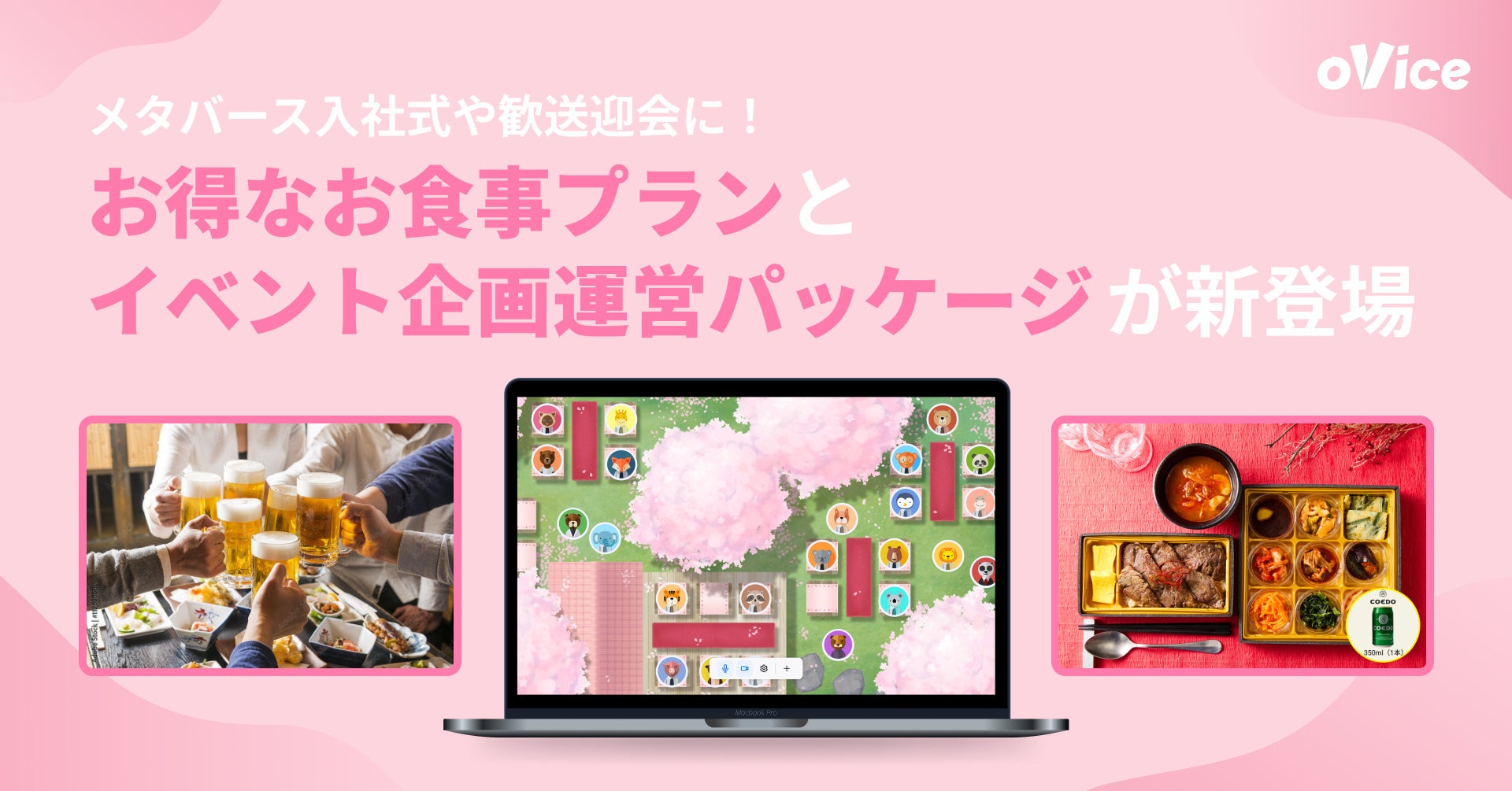 「oVice宴会」とは、バーチャル空間「oVice」を用いて会食を行う際の料理を参加者それぞれが指定した住所にお届けするサービスです。5名からお申し込みいただくことができ、初回のご利用時には開催規模にあわせて発行される専用のoViceスペースを1ヶ月間無料でご利用いただけます。(お申し込み期限:開催10営業日前の13時まで)