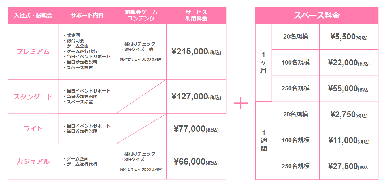 メタバースを活用した懇親会などのイベントの企画から当日の運営まで、まるごとoViceスタッフに任せられる「イベント企画運営パッケージ」をご用意しました。イベントの企画や当日の司会、参加者全員で楽しめるゲームの企画から進行まで、イベント全体を任せられる「プレミアム」パッケージ(215,000円、税込)から、メタバース上でのゲーム企画や進行のみを任せられる「カジュアル」パッケージ(66,000円、税込)まで、状況や予算に応じて選択できます。
