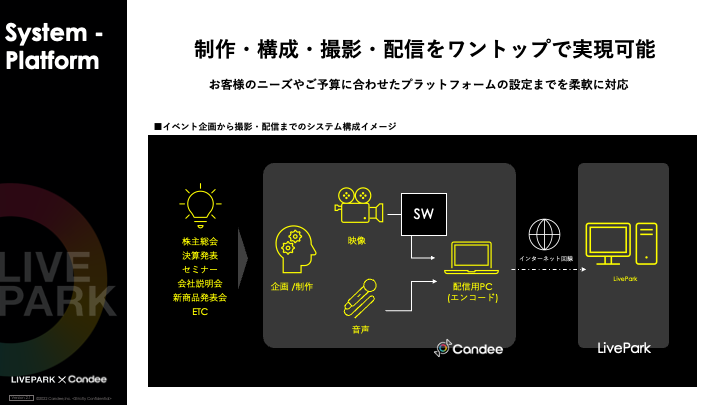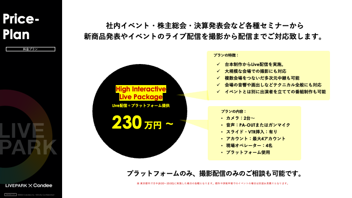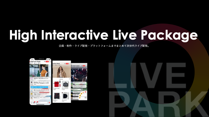 株式会社LivePark(東京都港区、代表取締役社長:安藤 聖泰)は、ライブ配信や動画制作を中心にデジタルマーケティングを手がける株式会社Candee(本社:東京都渋谷区、代表取締役:山村 嘉克、以下Candee)を通じて、LiveParkの視聴者参加型インタラクティブ配信プラットフォームを利用した企画・制作・配信〜プラットフォームまで安心安全な配信を行う「High Interactive Live Package」の販売を開始しました。「High Interactive Live Package」は、Candeeの提供するライブ配信の企画・制作とLiveParkが提供するインタラクティブなコミュニケーションを実現するライブ配信プラットフォームを組み合わせたサービスです。