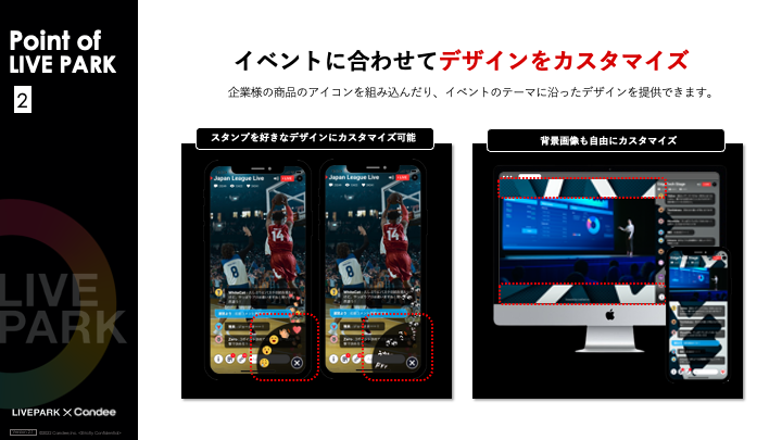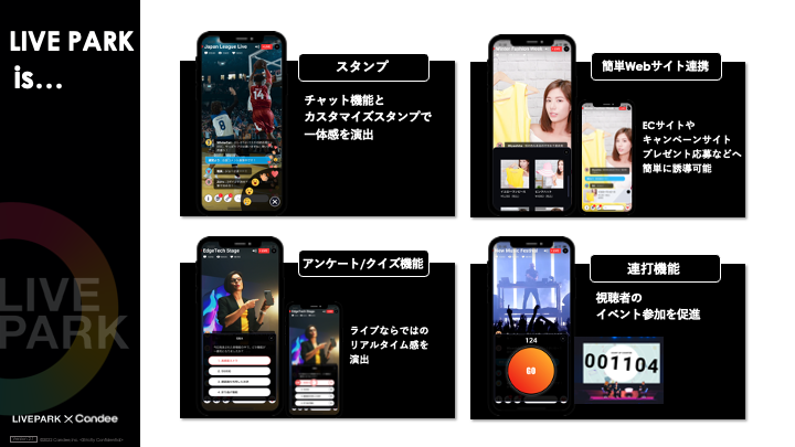 コメントやスタンプ、アンケートやクイズ、連打ゲーム、オリジナルスタンプ、商品紹介などのLIVEPARK特有の機能を使うことで一方通行な配信ではなく、参加者と会場の一体感を演出することが可能です。