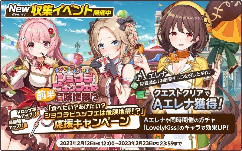 開催中のイベント「食べたい?あげたい?ショコラビュッフェは危険地帯!?」で編成すると、アイテムドロップ率とキャラクターの獲得経験値がUPします!