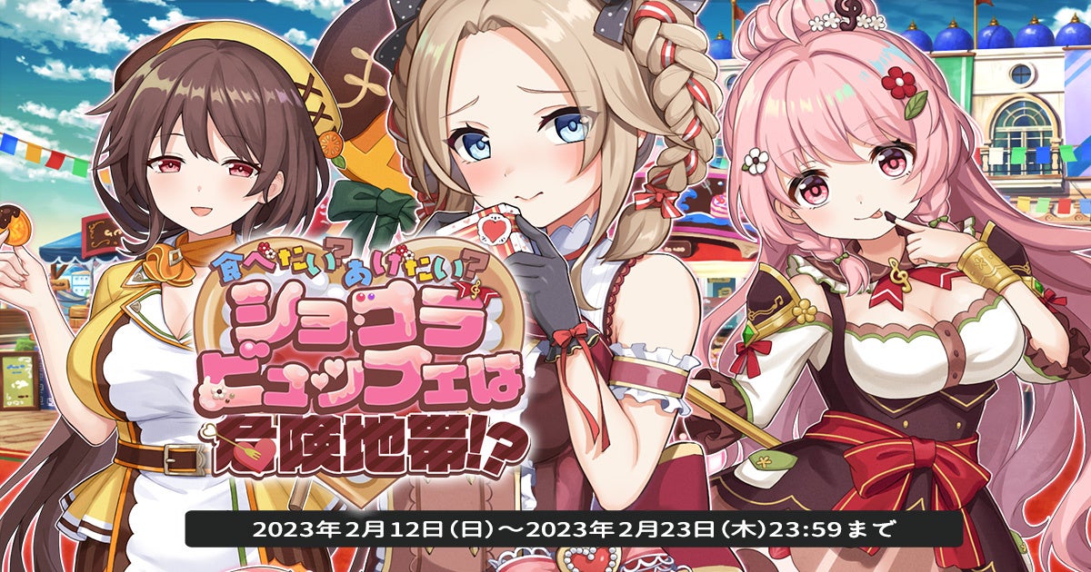 開催中のイベント「食べたい?あげたい?ショコラビュッフェは危険地帯!?」で編成すると、アイテムドロップ率とキャラクターの獲得経験値がUPします!