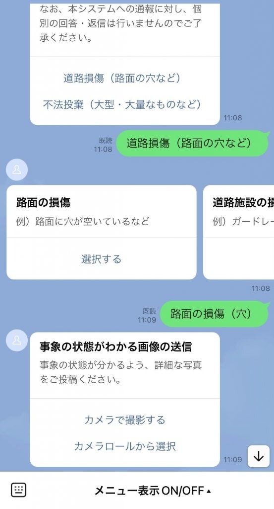 通報機能を活用し、道路の破損や不法投棄の情報をチャットボット形式のやりとりで通報が可能になりました。