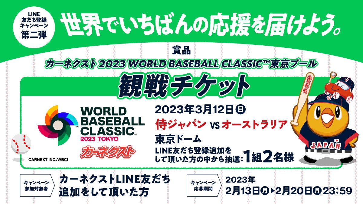対象期間内にカーネクスト公式LINEアカウントを友だち登録いただくと、抽選で1組2名様に、2023年3月12日(日)に東京ドームで開催される『カーネクスト2023 WORLD BASEBALL CLASSIC™ 1次ラウンド 東京プール』の侍ジャパンVSオーストラリア代表 の観戦チケットをプレゼントいたします。