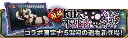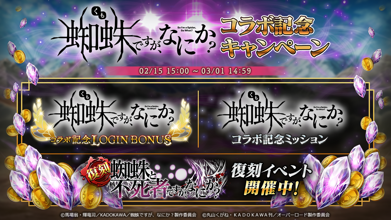 コラボを記念したオリジナルコラボイベント『[復刻]蜘蛛と不死者ですが、なにか?』を開催!コラボキャラクターが登場する召喚も同時開催いたします!その他、ログインボーナスや限定ミッションなども実施予定!