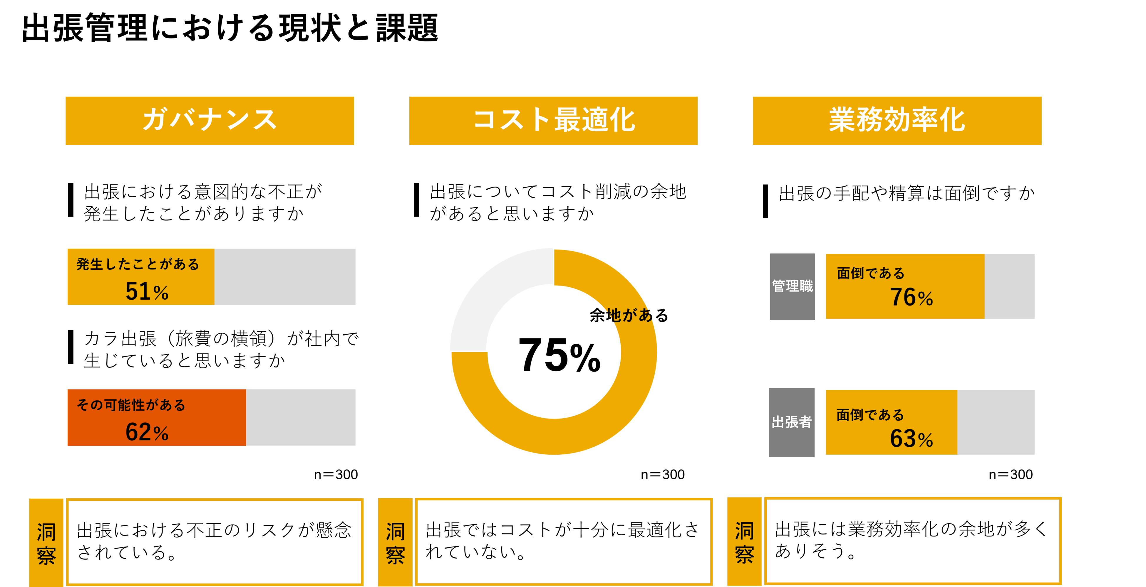一方で出張における普遍的な課題である、ガバナンス・コスト・業務効率化、それぞれの領域で多くの課題が残されており、改善の余地が見込まれています。