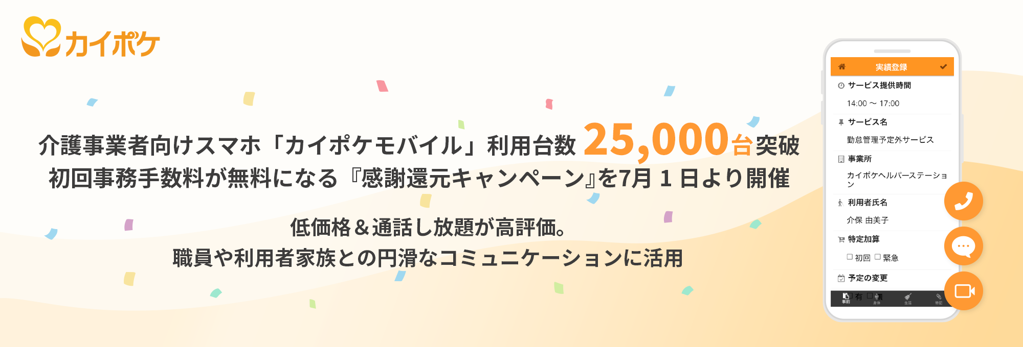 当社は、ICTを活用した40以上のサービス・機能を通じて、介護事業者の経営・業務の効率化や働き方改革をサポートする「カイポケ」を2006年より展開しています。「カイポケ」の付帯サービスとして、2018年2月より介護業界として初(※5)のスマートフォンレンタルサービス「カイポケモバイル」の提供を開始しました。サービス開始以来、利用台数は順調に増加し、この度、2022年4月末時点での利用台数が25,000台を突破しました。