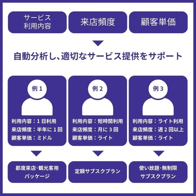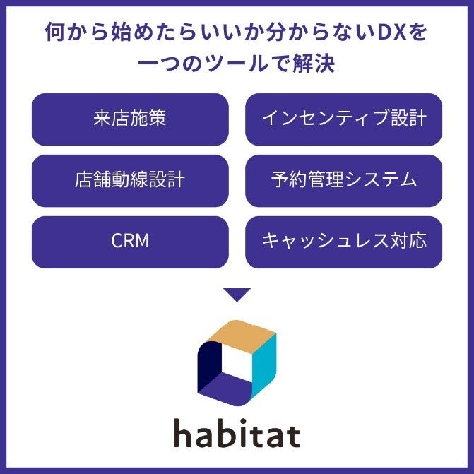 「habitat」は、顧客ごとの入退店の計測と決済金額を自動分析し、それぞれの店舗における顧客グループごとのLTV(Lifetime Value・顧客生涯価値)の計測と、それに伴うCRM(Customer Relationship Management・顧客関係管理)の設計を提案することが可能な、温浴施設向けのOMO(Online Merges with Offline・オンラインをオフラインと融合する)ツールです。このツールを導入することで従来型の温浴施設でも簡単に会員制サブスクリプションサービスを提供することができるほか、来店回数の上限を設定し、顧客情報を管理することで安心して事業運営が行えます。なお、現在、東京・大阪・東北・北陸の複数の温浴施設で導入が進んでおります。