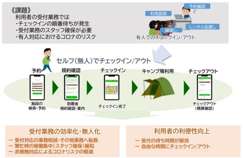 受付業務の簡略化により、利用者の利便性が向上するとともに、キャンプ場スタッフの受付対応業務の省力化により、その他業務への効率的な業務配分に寄与し、キャンプ場のサービス向上を図ります。