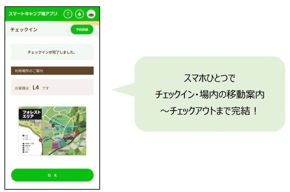 キャンプ場利用者のスマートフォンに「なっぷ」専用アプリケーション(以下専用アプリ)をインストールし、「なっぷ」と予約情報・会員情報を連携することで、スマートチェックイン(無人受付)を行います。