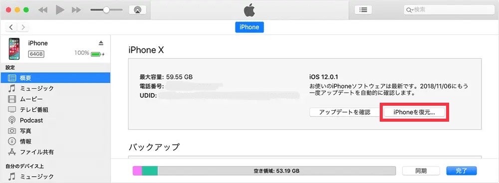 Step3:パソコンの左上に表示されるデバイスアイコン>「復元」の順にクリックすると、しばらくしてiPhoneが初期化されて画面ロックが解除されます。