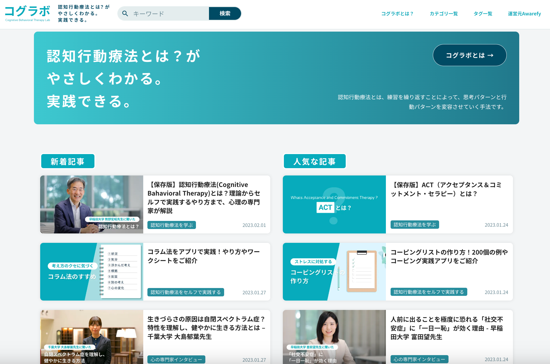 現在、認知行動療法の理論の解説記事や、コーピングリストの作り方、コラム法のやり方など具体的な実践の記事まで、30本以上の記事を掲載しています。今後も、読者の方々にとって役に立つ記事を増やしてまいります。