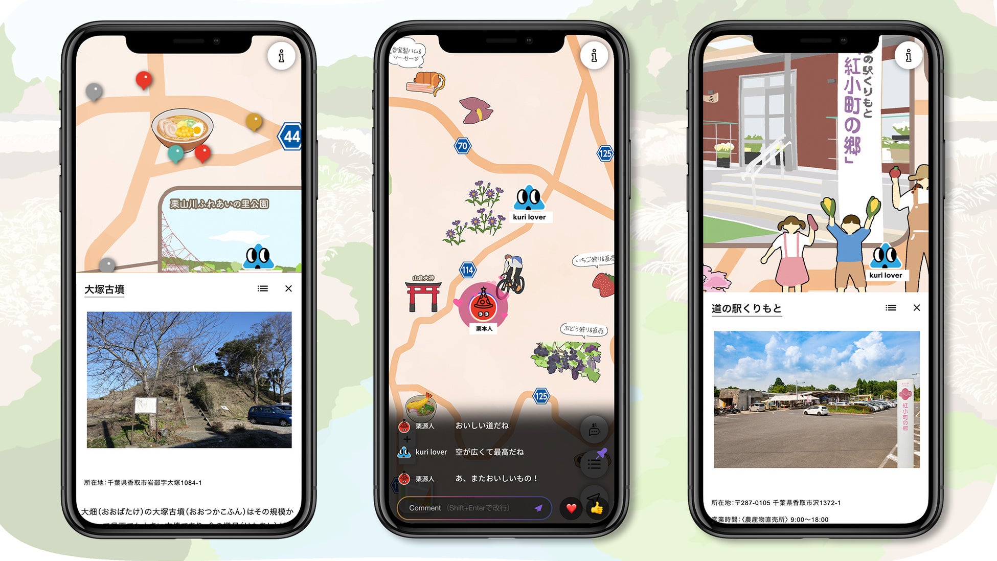 日本の玄関口、成田国際空港から車やバスで20分あまりとアクセスしやすい千葉県・香取市は、高級百貨店でも販売されるブランド品のさつまいも「紅小町」が特産です。イラストマップには、希少価値が高く「幻の品種」としても知られる紅小町を、もみ殻を使った方法で美味しく焼きあげる「焼き芋体験」や、朝採りの新鮮野菜や特産のぶどう・梨・イチゴといった果物などが並ぶ農産物直売所、地元の食材で作った料理を味わえる食事処など、市内の60以上の施設や体験のスポット情報を掲載し、地域の魅力を発信します
