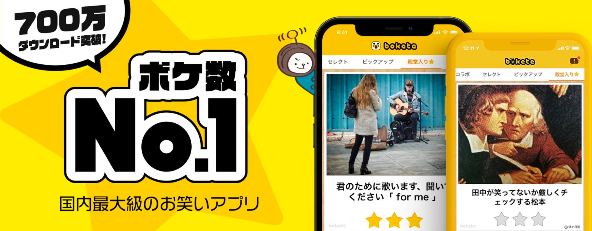 これまで700万ダウンロード、累計1億件のボケ投稿を記録しており、疲れたとき、辛いとき、悲しいときに心が和らぐ「笑い」を提供いたします。