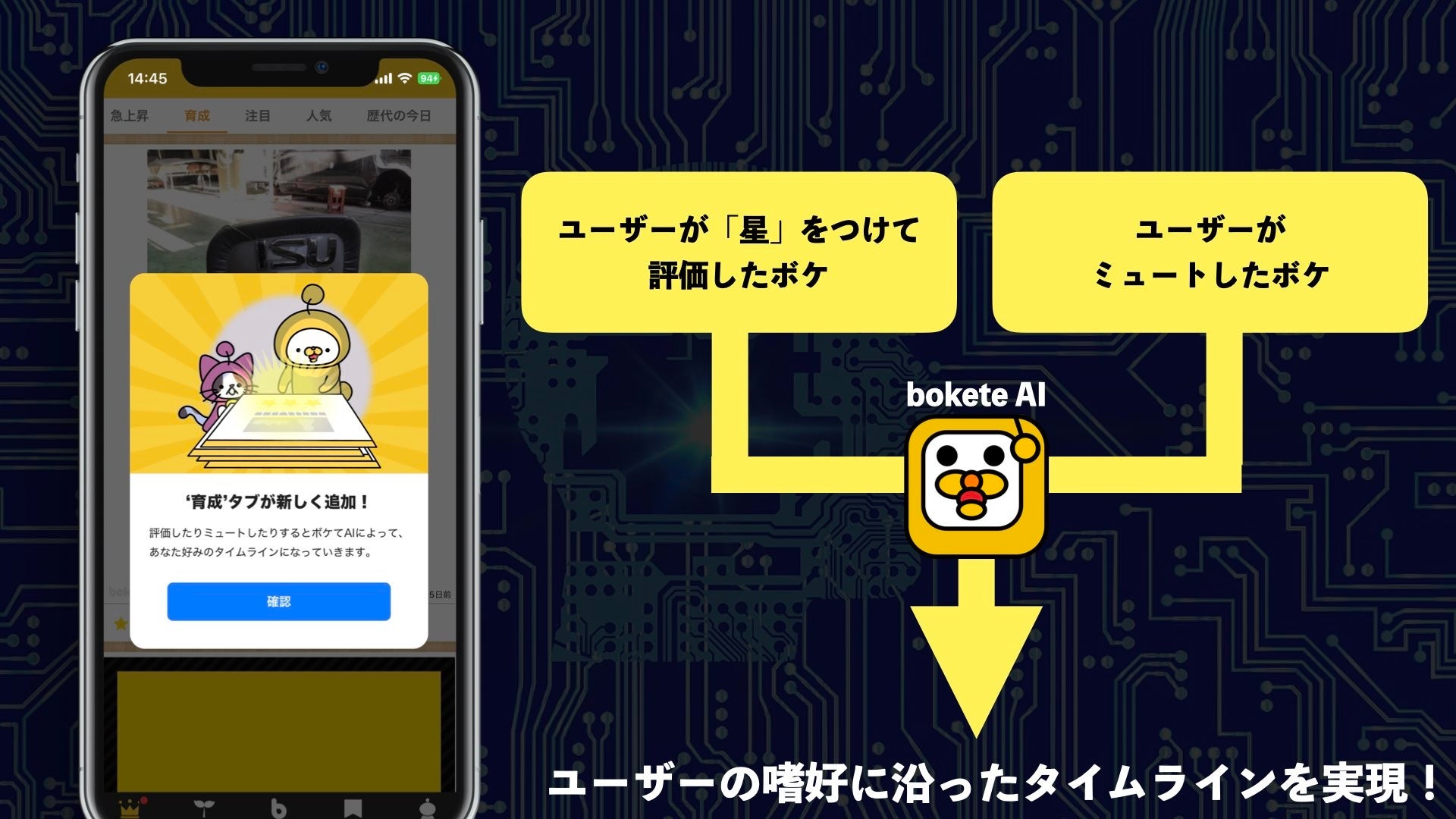 ユーザーが面白いと思って星をつけた(評価した)ボケと、ユーザーの琴線に触れずにミュートしたボケのデータから、AIがユーザーが「評価するであろうボケ」を選定し、世界でたった一つのタイムラインを表示いたします。