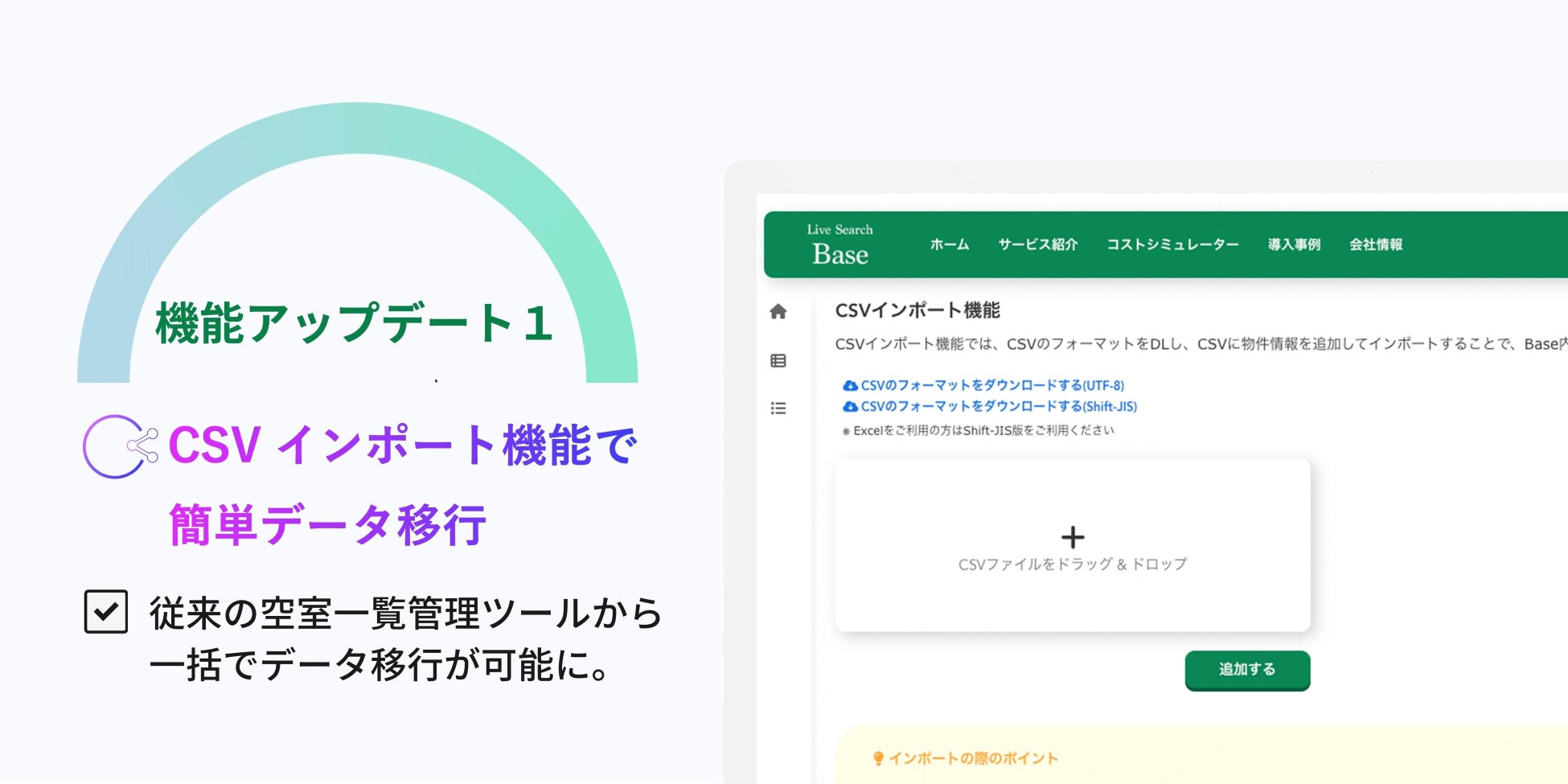 従来の管理ツールから、一括でデータをインポートできるようになりました。これによりBaseへの手動入力が不要となり、多くの情報を時間をかけることなく移行できます。作業も簡単で、例えばExcelからデータを移行するには、弊社で用意したCSV形式対応フォーマットをダウンロードし、Excelのデータをコピー&ペーストして保存することでインポートが可能となります。